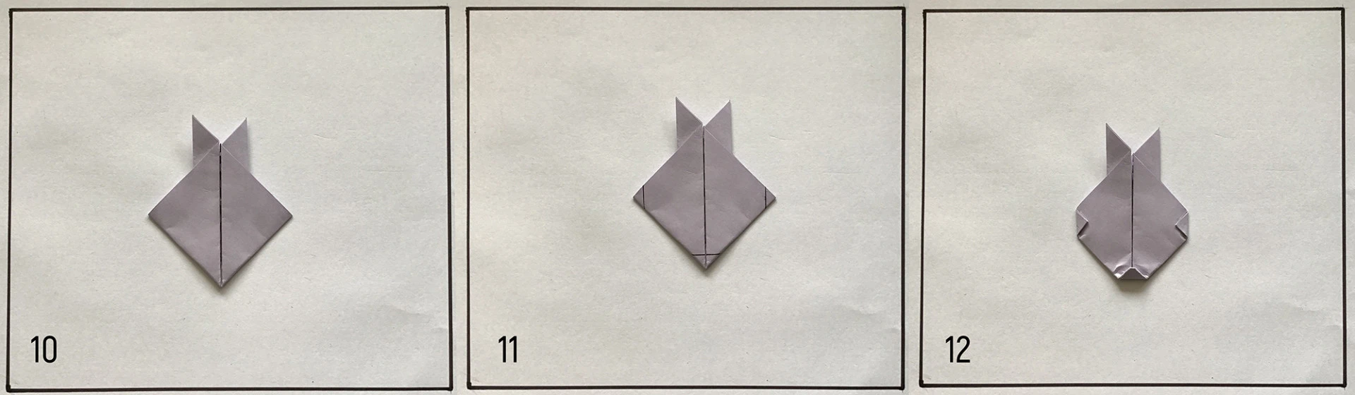 10. Ortadaki çizginin eşit iki parçaya ayırdığı alt kenarın sağ parçasını ortadaki çizgiye doğru katlıyoruz. Tavşanın yüzü oluşmaya başladı.